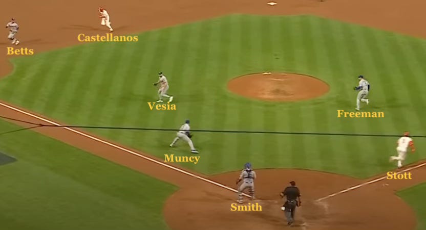 “They ran it as perfectly as you can,” said Stott postgame. “They just did it exactly how they drew it up.” They did it so exactly that neither Stott nor any other Phillie, all of whom are trained to look for it, even noticed the Dodgers spinning the wheel.