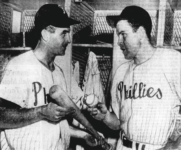Gran Hamner— he despised “Granny”—played 16 years for the Phillies, part of the time as team captain. But many years in Philadelphia were less than idyllic. When [owner Bob] Carpenter “accidentally” assigned a private detective to shadow Hamner, the relationship slipped from volatile to soap-opera-like. Nor did Hamner’s makeup ameliorate the situation. Described as “mean, hot-tempered and plenty rough,”the infielder’s “fire-eating” personality often served to pour gasoline on the proverbial fire.